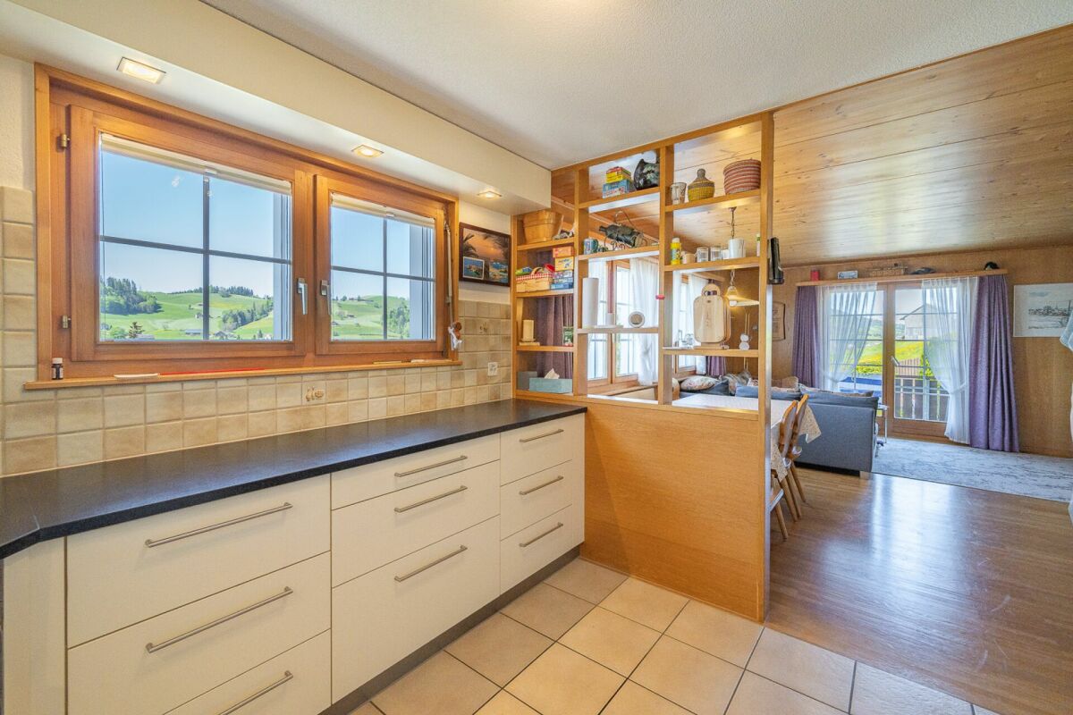 - Stilvoll integrierte, offene Küche mit Blick ins Grüne